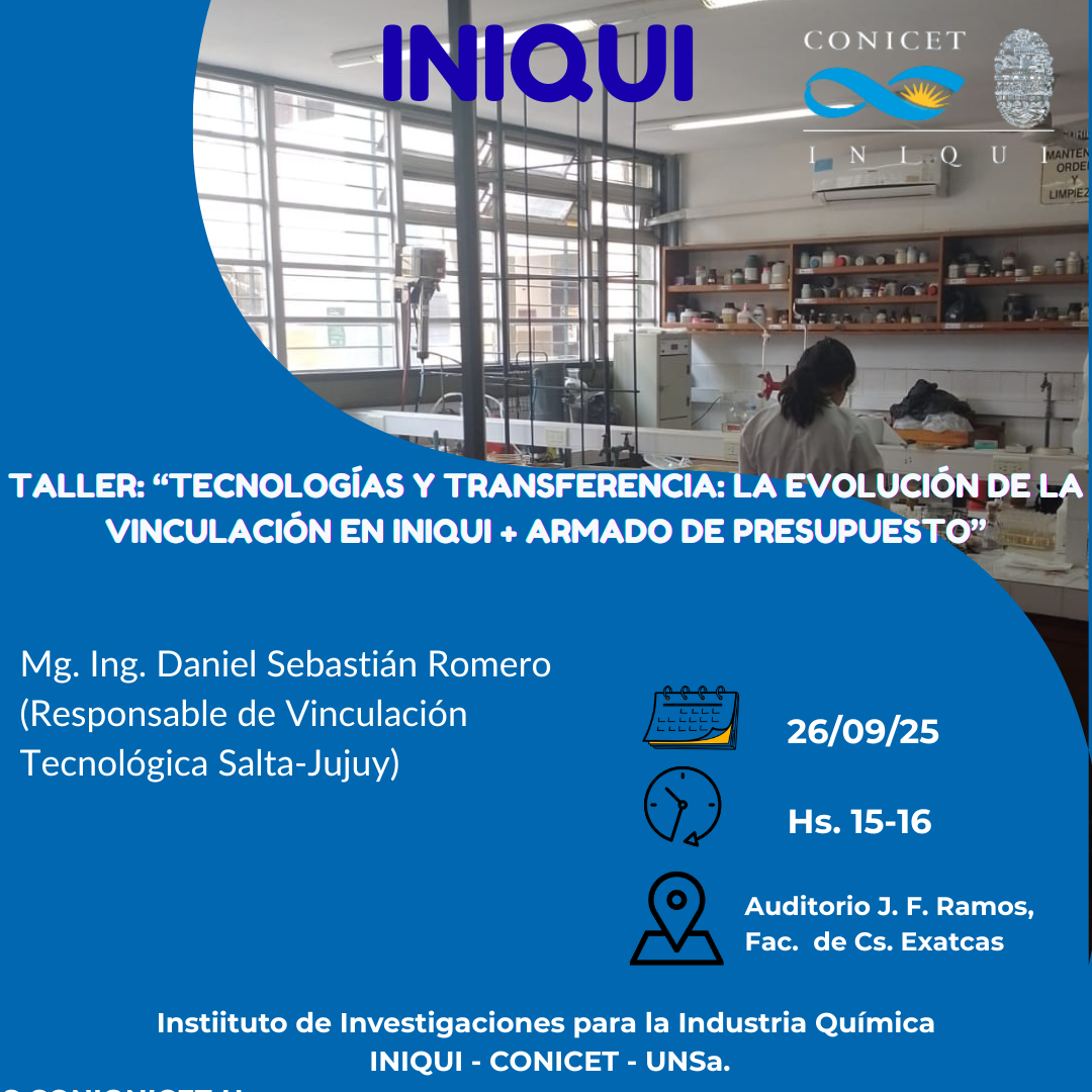En el marco de los Seminarios organizados por el INIQUI, se realizó el Taller: “Tecnologías y Transferencia: La evolución de la Vinculación en INIQUI + Armado de Presupuesto” a cargo del Mg. Ing. Daniel Sebastián Romero (Responsable de Vinculación Tecnológica Salta-Jujuy), el día viernes 26 de setiembre del cte. año, en el Auditorio Juan Francisco Ramos (Ex Aula Virtual), Facultad de Ciencias Exactas.